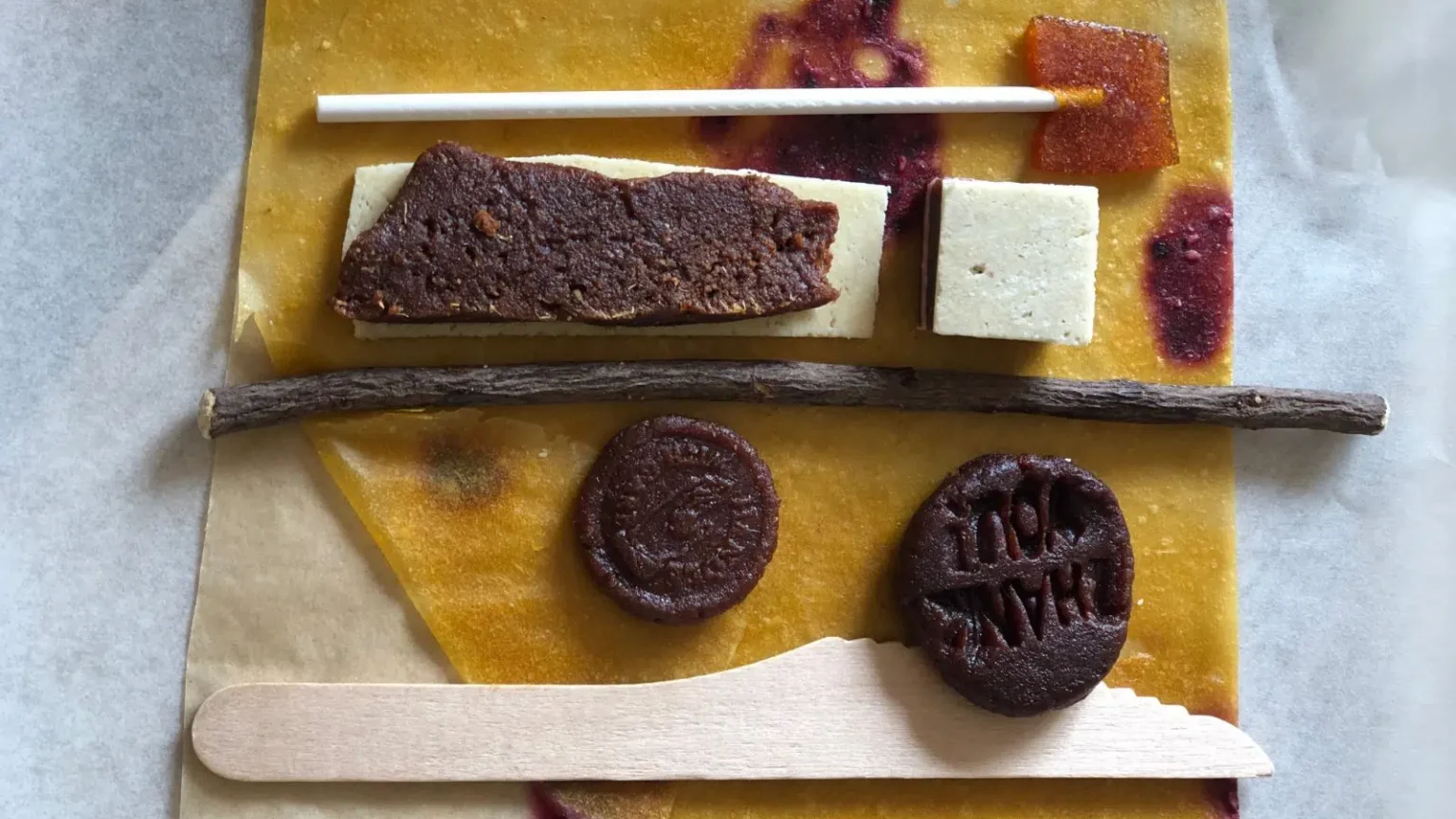 De ingrediënten worden samen met een houten mesje verpakt in vetvrij papier en als placemat opgerold aangeleverd.